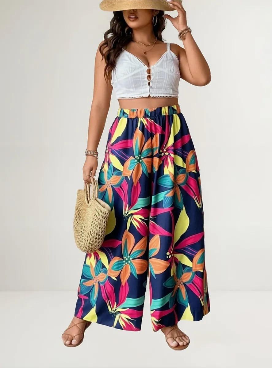 Neste verão 2026, a pantalona estampada é um hit, trazendo flores, folhagens tropicais, listras coloridas e poás (bolinhas), com destaque para as versões fluidas e leves em tecidos naturais como linho e algodão, cintura alta e modelagem ampla, combinando com coletes ou tops para looks frescos e estilosos, do casual ao sofisticado.