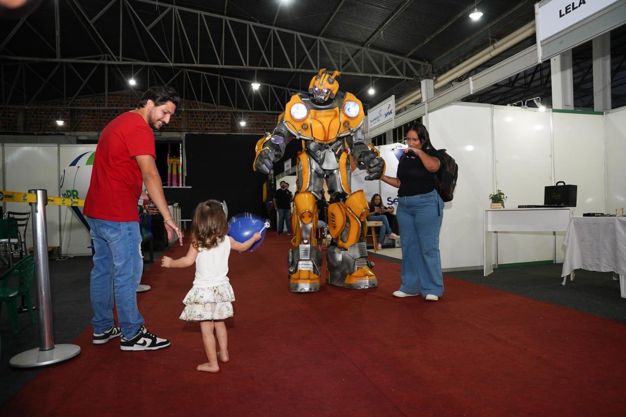 Inspirado no personagem Bumblebee, da franquia Transformers, o robô circula pela feira interagindo com o público, visitando estandes e arrancando reações de surpresa, admiração e muitas fotos. A presença do personagem foi planejada justamente para isso: provocar impacto e tornar a experiência dos visitantes ainda mais divertida.