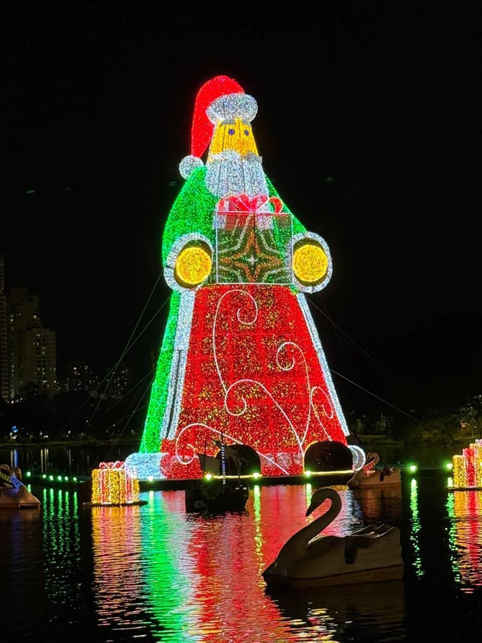 Para sustentar o gigante de 27 metros, o Papai Noel foi instalado sobre balsas flutuantes, presas a quatro âncoras fixadas no fundo do lago.
