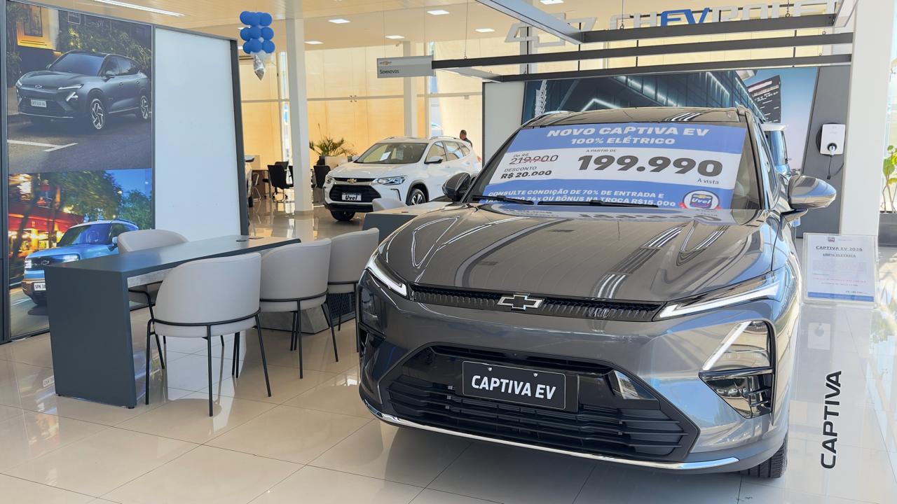 A eletrificação também é destaque nas unidades da Uvel com o lançamento do Novo Captiva EV, modelo 100% elétrico disponível pelo preço de 199.990 reais à vista.