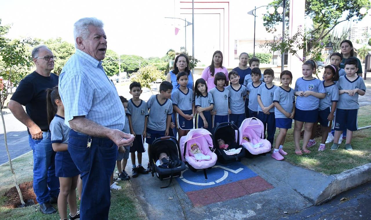 O prefeito Fernando Scanavaca, a primeira-dama e secretária da Saúde, Lisbeth Scanavaca, e os secretários do Meio Ambiente, Cláudio Marconi, e da Educação, Letícia Labiak, receberam as cinco primeiras crianças contempladas pelo projeto (entre as quais, três irmãs gêmeas), junto com seus pais.