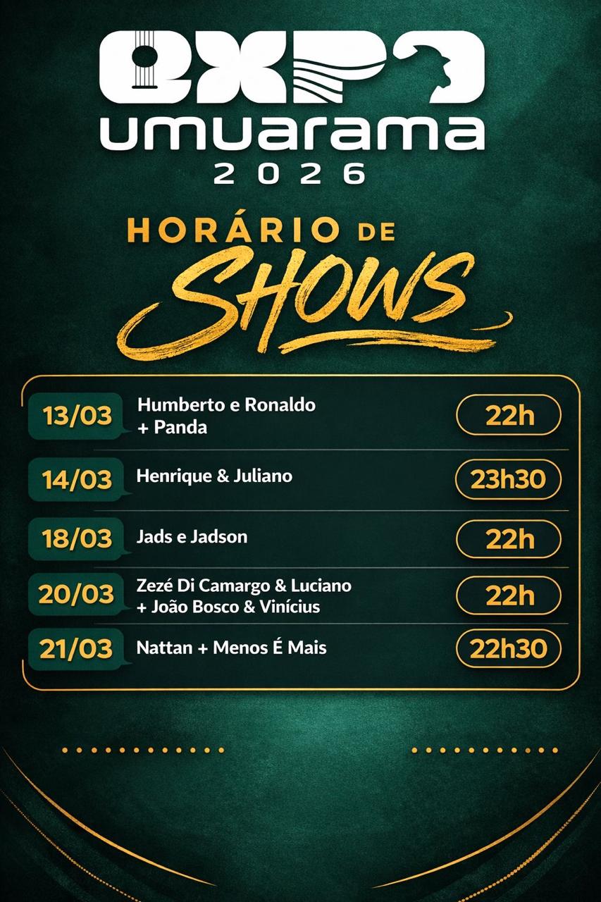 A Sociedade Rural de Umuarama (SRU) divulgou os horários oficiais dos shows da 51ª Expo Umuarama/24ª Internacional, que será aberta na próxima quinta-feira, 12, e seguirá até o domingo, 22 de março, no Parque Internacional Dario Pimenta da Nóbrega. A programação musical da feira reúne grandes nomes da música brasileira e apresenta uma variedade de ritmos que promete agradar públicos de diferentes gerações.