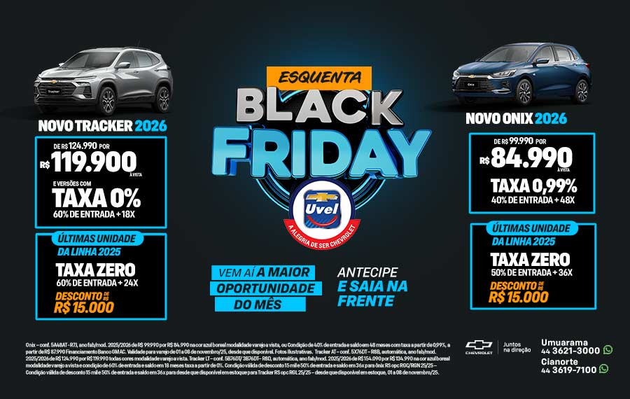 A Uvel Chevrolet, reconhecida concessionária nas regiões de Umuarama e Cianorte, dá o start na temporada de ofertas com o lançamento do "Esquenta Black Friday". A campanha oferece condições comerciais agressivas e antecipadas para os modelos mais procurados da marca: o SUV Novo Tracker 2026 e o hatch Novo Onix 2026.