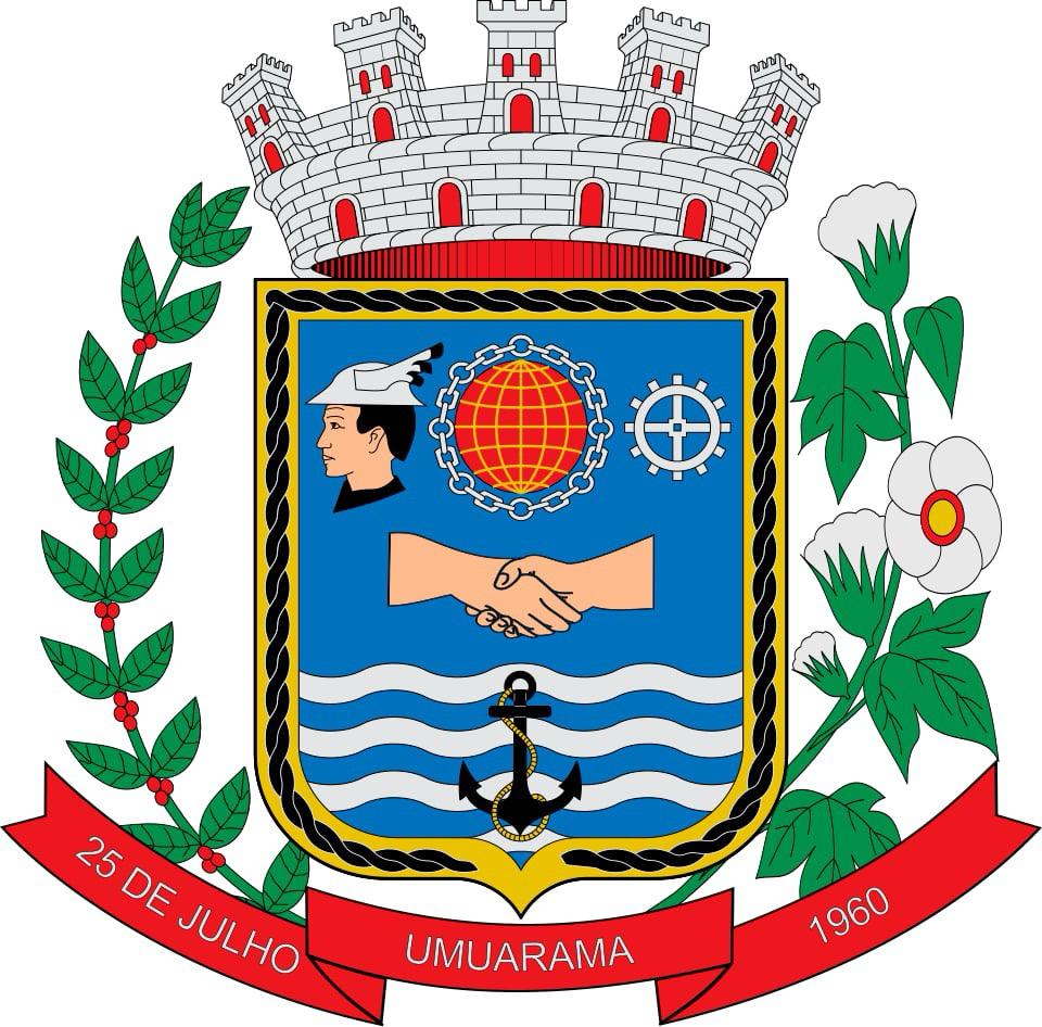 Um listel vermelho com o nome "Umuarama" e a data de emancipação política 25 de julho de 1960 em letras brancas sobre faixa vermelha constam do brasão que é o símbolo oficial do município. E o brasão está inserido na bandeira.