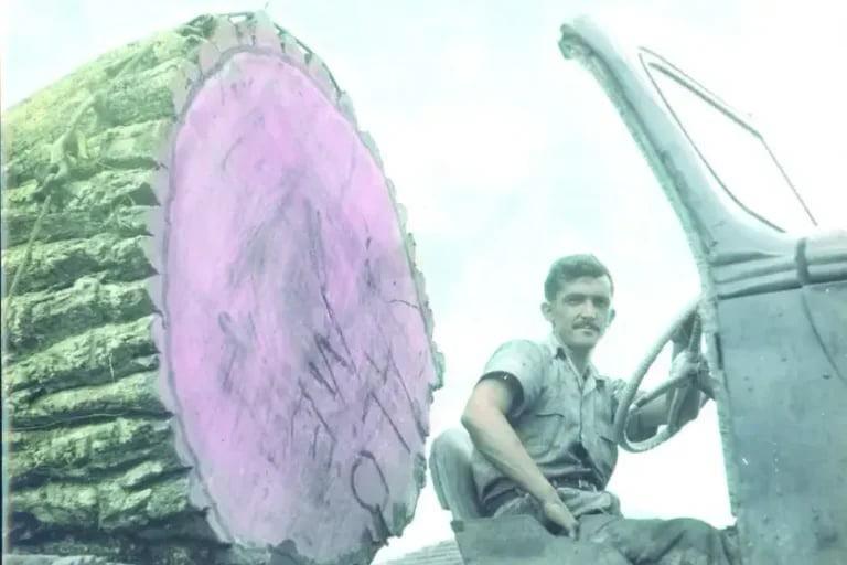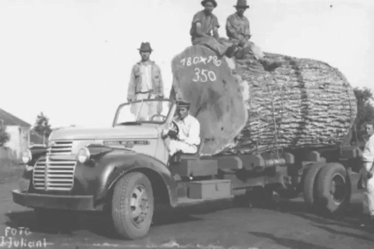 Outra imagem impressionante de uma peroba. Dependendo do tamanho, um caminhão suportava o peso de apenas uma árvore. E o transporte era sacrificado e perigoso entre as matas e a cidade pois as estradas eram de terra, esburacadas ou cobertas de barro depois das chuvas…